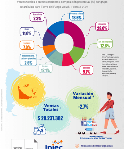 El Instituto Provincial de Análisis e Investigación, Estadística y Censos, dependiente de la Secretaría de Finanzas dentro del Ministerio de Economía, nos presenta la infografía Encuesta de Supermercados. - Febrero 2026