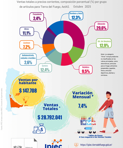 El Instituto Provincial de Análisis e Investigación, Estadística y Censos, dependiente de la Secretaría de Finanzas dentro del Ministerio de Economía, nos presenta la infografía Encuesta de Supermercados. - Octubre 2025