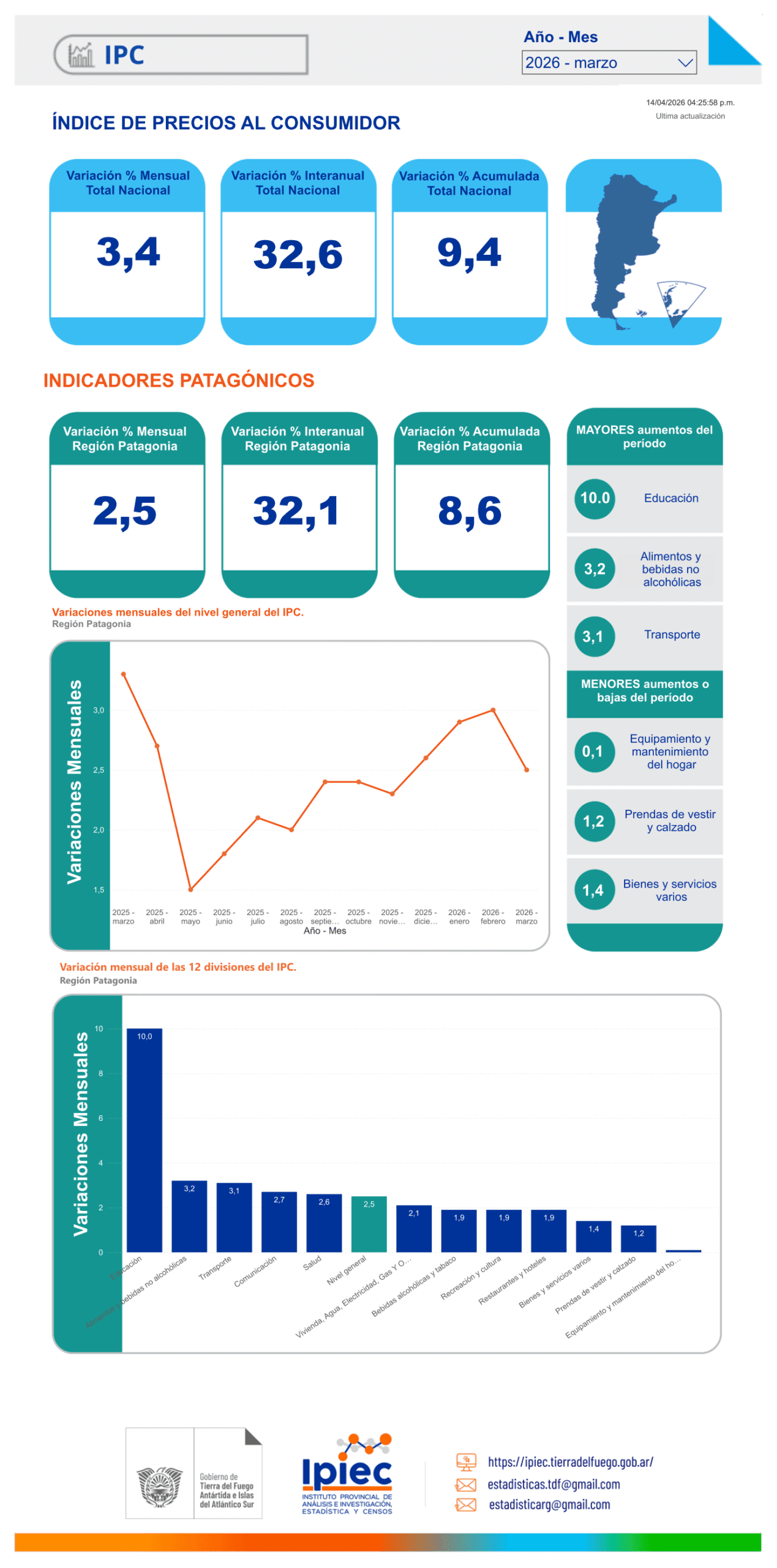 El Instituto Provincial de Análisis e Investigación, Estadística y Censos, dependiente del Ministerio de Economía de la Provincia de Tierra del Fuego, AeIAS, nos presenta la infografía IPC Región Patagonia. -