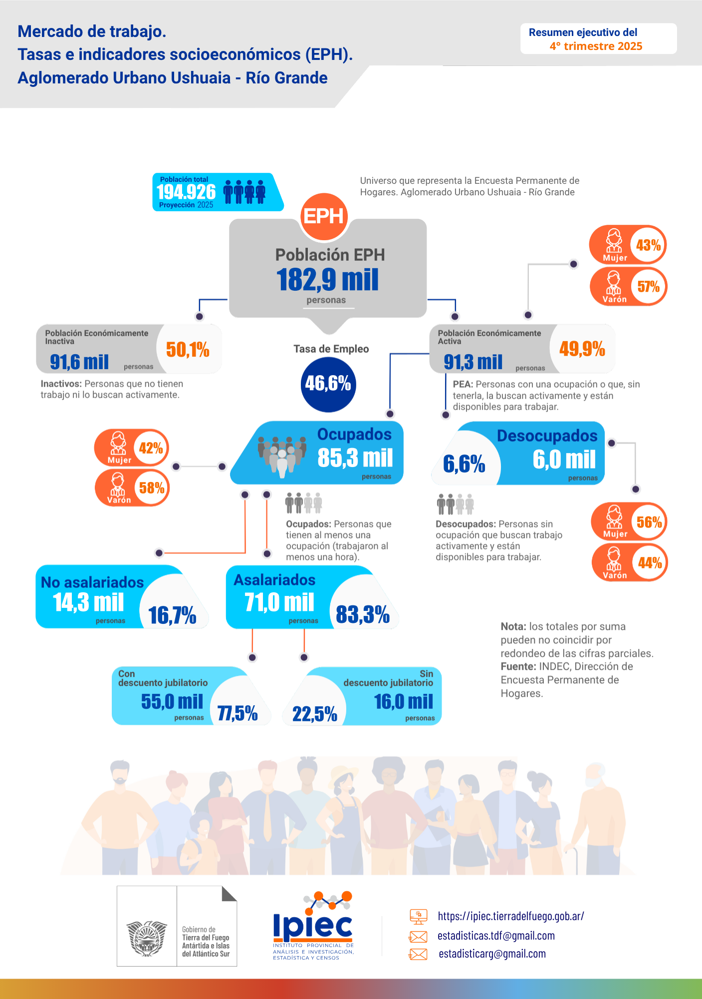Este informe presenta los principales indicadores del mercado de trabajo del aglomerado Ushuaia - Río Grande: tasas de empleo y de desocupación, de la población ocupada y desocupada. Para las tasas de empleo y de desocupación se presenta su composición interna según categorías de interés.